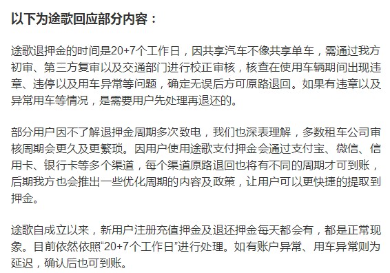 12 月 17 日,针对媒体关于途歌近日再曝“退押金难”,原本 7 个工作日应该退还的 1500 元押金迟迟拿不到,部分用户等待时长达两个月的问题,官方也给出回应,“途歌退押金的时间是 20+7 个工作日”。