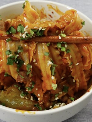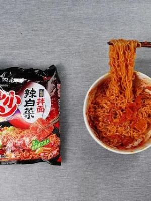里面有一块面饼、一袋酱包和一袋辣白菜包。制作时需要将面条放入沸水中煮3分钟捞出,再加入酱料和辣白菜搅拌均匀即可。一开始被它的名字误导了,以为是一款炒面,原来只是辣白菜是炒的意思。它和另一款蓝色包装的农心辣白菜拌面的区别是,另一款的辣白菜是脱水蔬菜包,而这一款是新鲜辣白菜包。