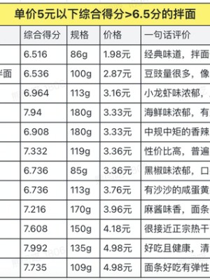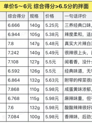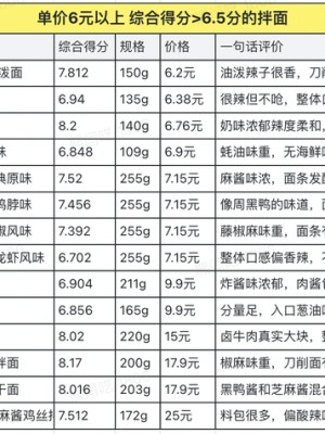 我们分别从价格维度、口味维度和场景维度,给大家整理出了本次测评中综合分数高于6.5分拌面,大家可以参考着来选购哟~