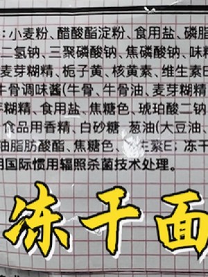 冻干面:在《T/FJSP 0007-2025 冻干方便米面制品》的团体标准中,将冻干面定义为:以小麦粉和/或杂粮粉为主要原料,添加或不添加辅料,经和面、压延成型、蒸煮、冻干等工序制成的面块;或以面条为主要原料,经熟化、动感、包装等工序制成的面块;搭配或不搭配方便面调料,组合包装而成的产品。