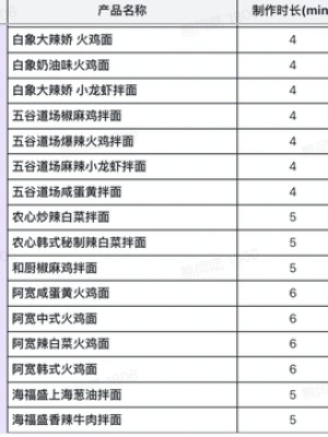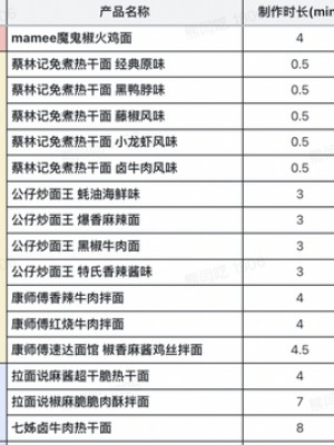 本次拌面共分为杯装、碗装、盒装和袋装四种包装,制作时间在0.5分钟~9分钟之间。