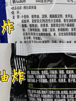 油炸拌&非油炸方便面:在《GB 17400-2015 方便面》的食品安全国家标准中,将方便面定义为:以小麦粉和/或其他谷物粉、淀粉等为主要原料,添加或不添加辅料,经过加工制成的面饼,添加或不添加方便调料的面条类预包装方便食品,包括油炸方便面和非煮油炸方便面。将油炸方便面定义为:采用油炸工艺干燥的方便面。将非油炸方便面定义为:采用除油炸以外的其他工艺(如微波、真空和热风等)干燥的方便面。