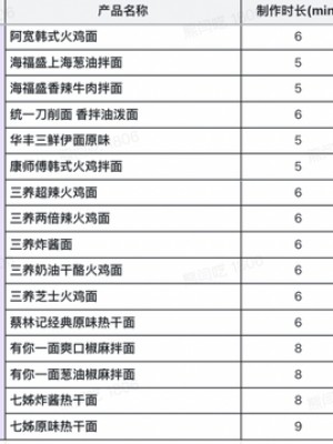 其中制作时间最短的为蔡林记免煮热干面系列,由于面条为方便湿面材质什么时候,只需要热水煮或者烫30秒即可。制作时间最长的为七姊原味热干面,面条为挂面材质,需要烹煮6~9分钟,相较于其他面条制作时间稍长一些。