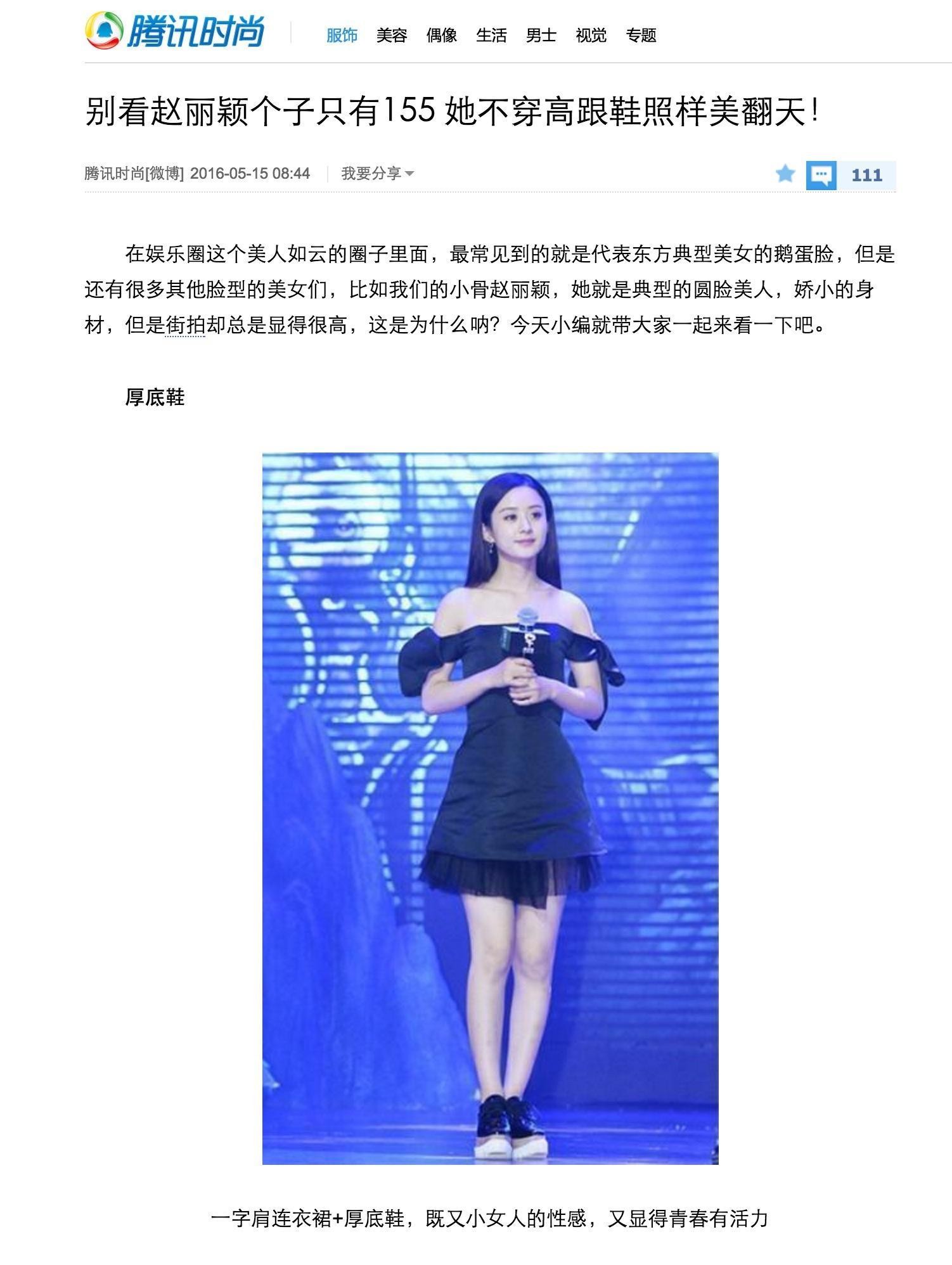 最近我们关爱八卦成长协会的微信上又有小老婆发来赵丽颖身高疑似造假十公分的爆尿,称官方身高1.65的赵丽颖穿着恨天高,竟和1.65的运动员吴敏霞一样高!