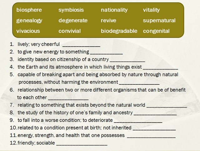 biodegradable;congenital;nationality;genealogy;supernatural;convivial;vivacious;vitality