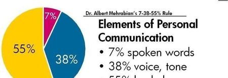 人的主要沟通方式有两种,声音与视觉:声音语调占45%,身体语言占55%(更为重要)。