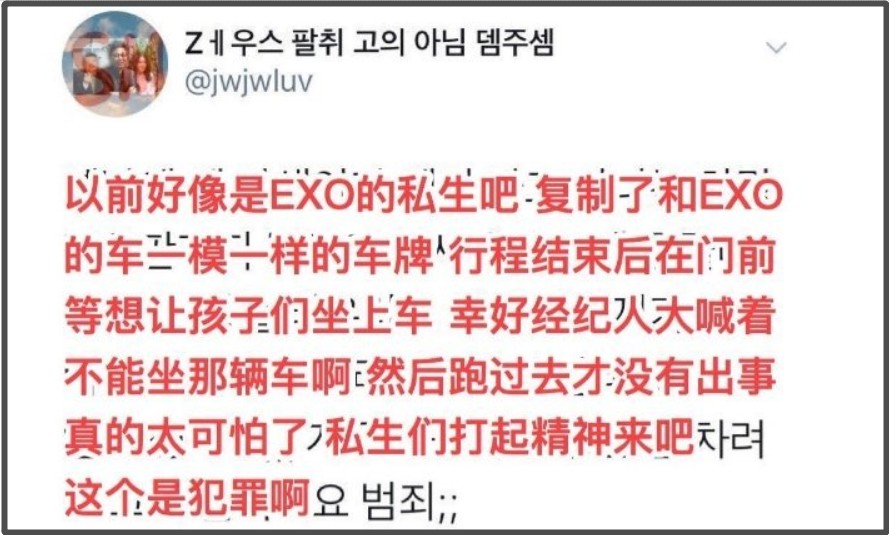 最近,另一位网友透露了韩国的私生子行为。受害者是韩国男团EXO。