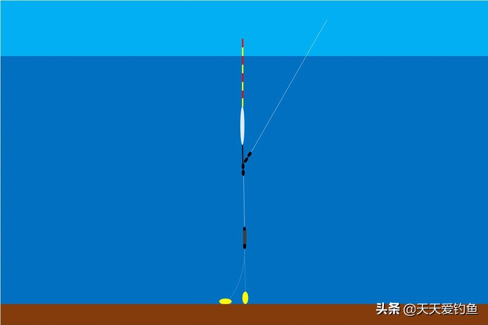 找底可以挂双饵也可以挂单饵,如果挂单饵的话要挂上钩,让钓目稍稍大于2目,这时候就是下钩饵完全躺底,上饵开始触底的状态,这个就是传说中的不灵不钝。在使用这种调漂方法时,有很多的好处。