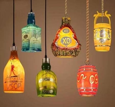 样式再别致一些的酒瓶,可以安上灯泡,扯上电线,装上开关,做吊灯也蛮不错的。但是要注意用电安全哦!做好灯泡的散热工作。