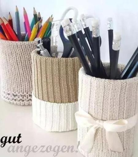 第二种方法就是用袜子做成笔筒,可以用厚一点的卡纸或者饮料瓶做出笔筒的形状,然后把袜子裁剪合适的大小,直接套进去,一个袜子笔筒就做好了。觉得单调的可以自己加一些装饰哦!