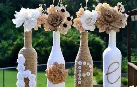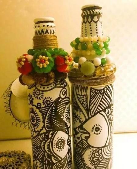 如果是玻璃材质的,可以绕上麻绳,彩色的绳子也可以,然后做花瓶装饰。没有绳子的话,也可以刷上漆,画上图案做装饰!