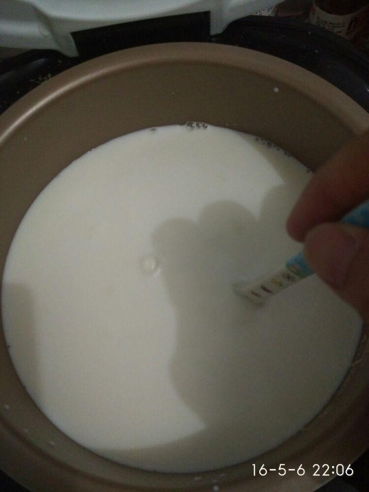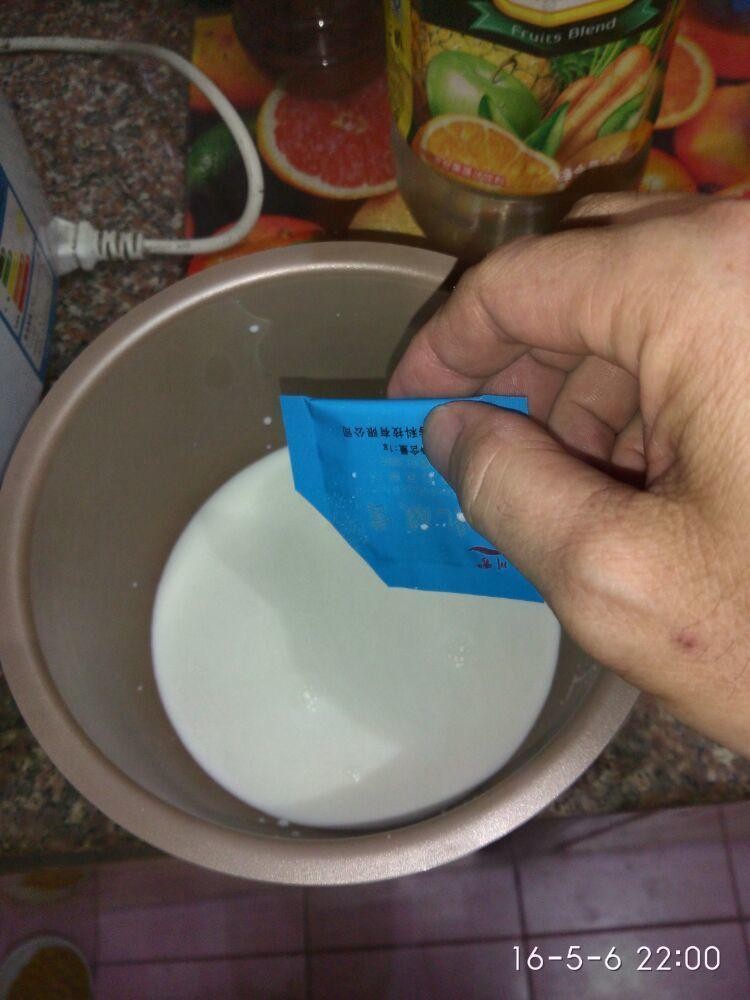 将另一支200毫升纯牛奶加倒入电饭煲,然后加入发酵菌种,搅拌直到完全容解。