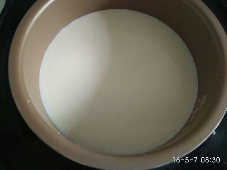 再将另外三支奶和有糖牛奶一起加入搅拌均匀,然后插上电源,盖上电饭煲盖。