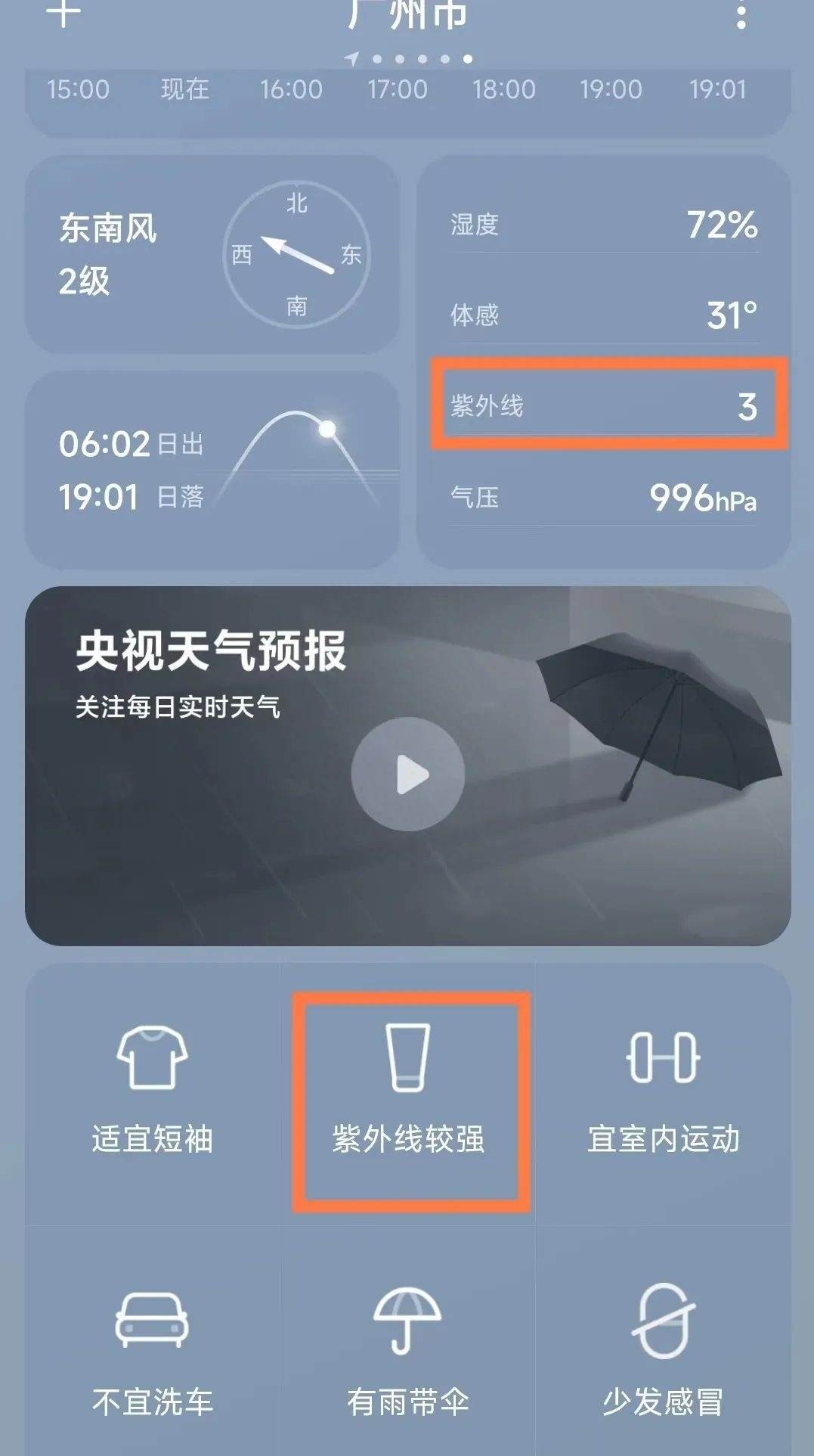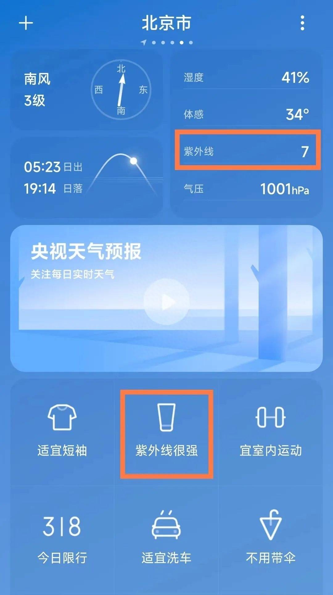 至于怎么看紫外线指数,打开手机上的「天气预报」软件,上面基本都会标注出当天的紫外线指数。
