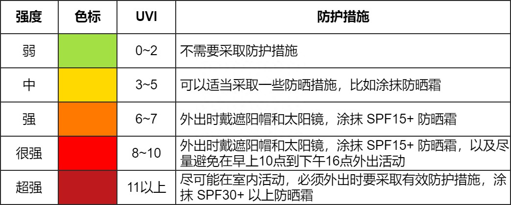 而不同的紫外线强度,防护措施也不同,具体可以参考以下表格: