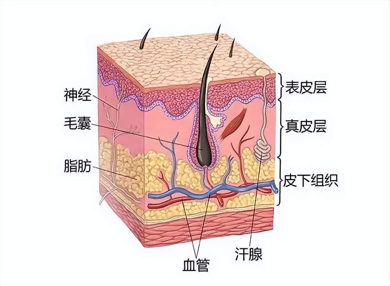 我们的皮肤由外向内可分为三层:表皮、真皮和皮下组织。