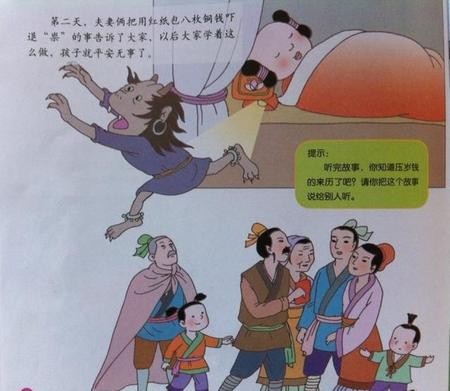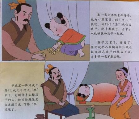 有一对老夫妻,老来得子,对儿子十分疼爱,大年三十晚上,夫妻俩用红线串了八枚铜钱逗孩子玩,当孩子玩累了沉沉睡着时,夫妻俩就把铜钱放在枕边,然后老夫妻俩守着孩子,光怕自己睡着了,“祟”来伤害孩子,但是老夫妻俩年岁已大,到了四更天,实在熬不住就睡着了,这时候,“祟”出现了,但是它刚要摸孩子的头,只风枕边的铜钱发出一道金光射向“祟”。“祟”尖叫着逃跑了,而孩子安然无恙。从此人们纷纷效仿,在除夕夜用红纸包了钱给孩子,意为“压祟钱”,天长日久,变成现在“压岁钱”的叫法。