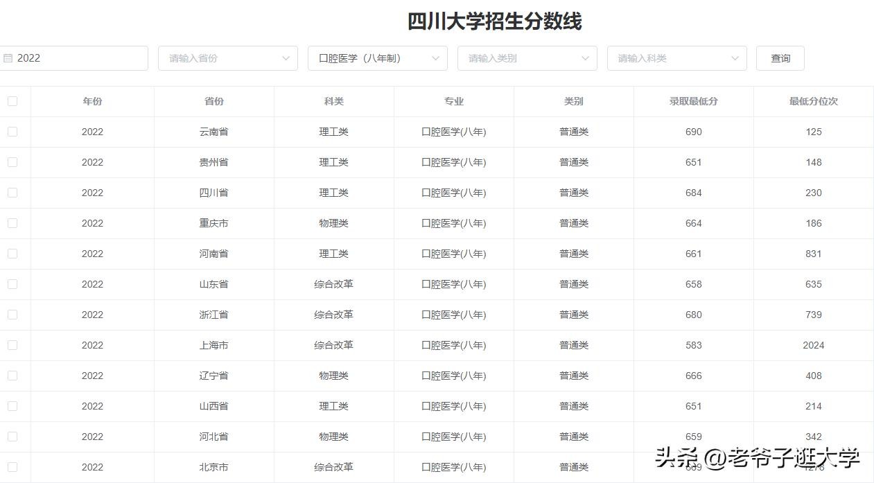 川大华西医学院口腔医学八年制在12个省份招生,录取分数线位次接近复旦上海医学院,高于中大中山医学院、华科同济医学院。