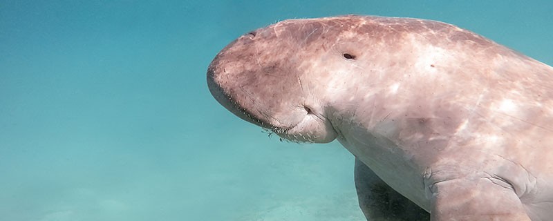 儒艮,身体呈纺锤形,体型较大,全身覆盖着又细又短且稀疏的体毛,头部较小,而且不具备明显的颈部,上嘴唇的形状像马蹄,没有外耳廓,背部呈深灰色,腹部颜色稍浅,主要生存在热带浅海中,它的分布和海流、水温以及主要食物的分布有着密不可分的关系。