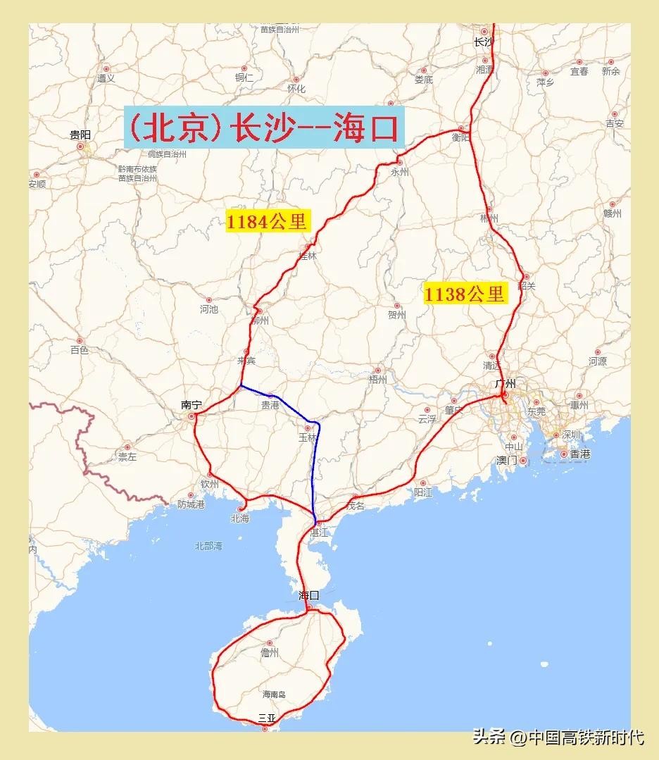 北京至海口的另外一条高铁路线,途经北京西~石家庄~郑州东~武汉~长沙南~桂林南~湛江西~海口,总里程约2684公里,在南衡高铁建成后,应该也会开通北京至海口的高铁列车。