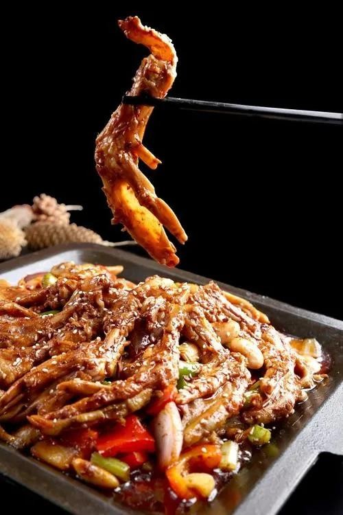 是需要将活生生的鸭子放入铁板上,开始烤制。烤着的鸭掌会到处乱跳,从而形成一种美味的佳肴。当鸭掌熟了以后会切去,直接食用。