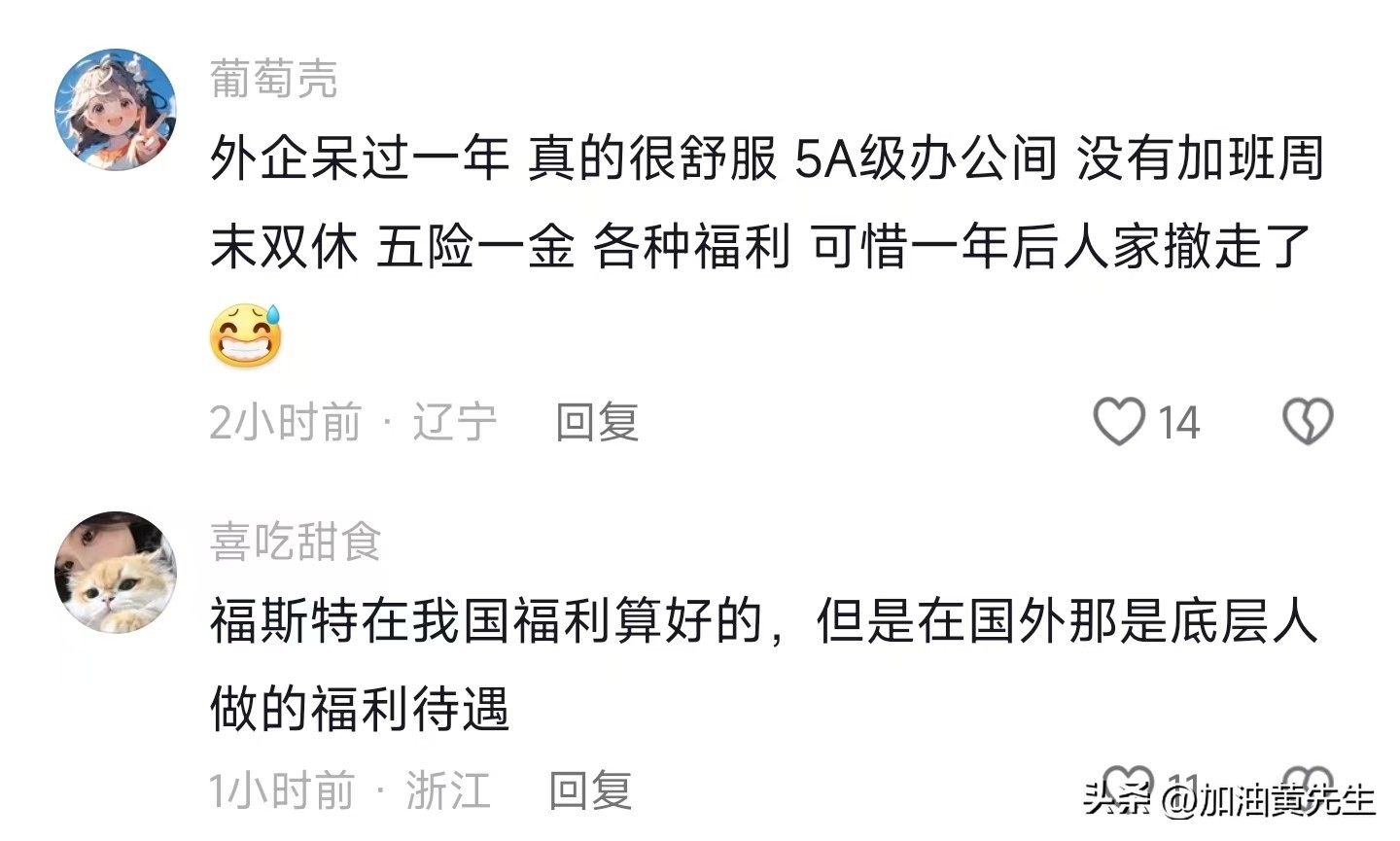 3、福斯特在我国福利算好的,但是在国外那是底层人做的福利待遇。