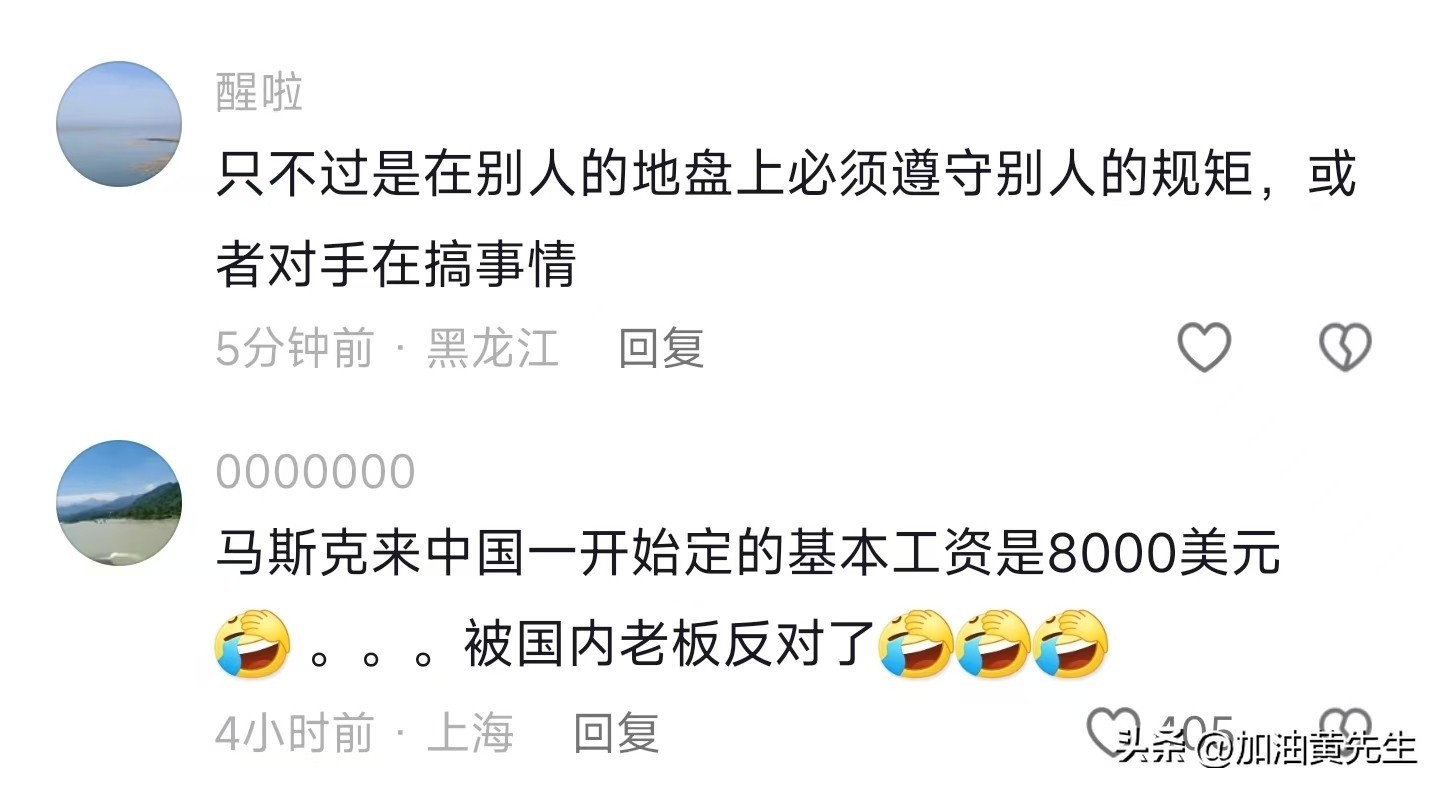 1、马斯克来中国一开始定的基本工资是8000美元 ,被国内老板反对了。