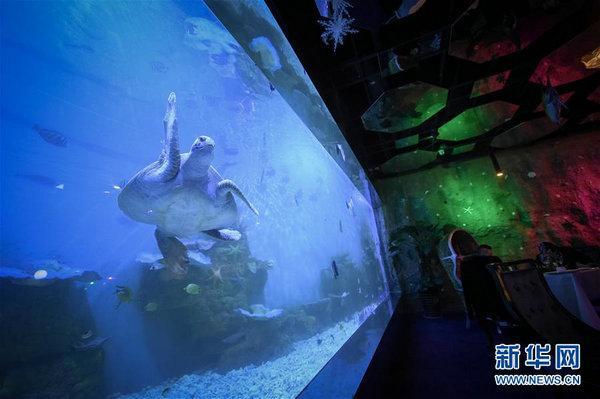 12月22日,在位于合肥蜀山区的海洋主题餐厅内,一只海龟在游动。当日,安徽省合肥市的首家海洋主题餐厅正式营业。顾客在品尝美食的同时,还可观看海洋生物及“美人鱼”在餐桌旁游弋。