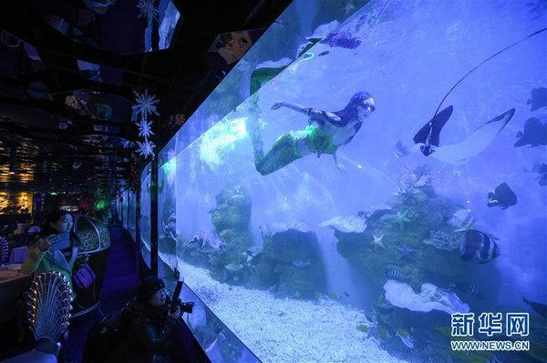 12月22日,在位于合肥蜀山区的海洋主题餐厅内,“美人鱼”在为顾客表演。当日,安徽省合肥市的首家海洋主题餐厅正式营业。顾客在品尝美食的同时,还可观看海洋生物及“美人鱼”在餐桌旁游弋。