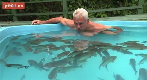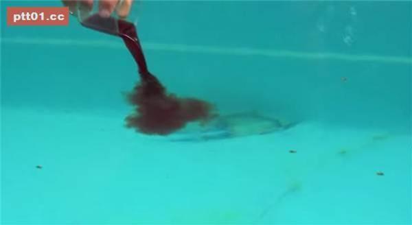 不过杰瑞米当然不是一开始就下水。因为食人鱼会因为血腥味而极度兴奋,于是先滴了几滴鲜血到泳池试试看。结果食人鱼没什么反应…