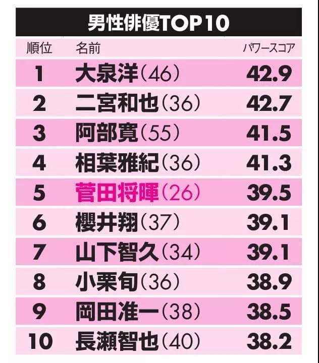 最后附上《明星影响力排行榜2019年版》日本男演员榜的前十位名单: