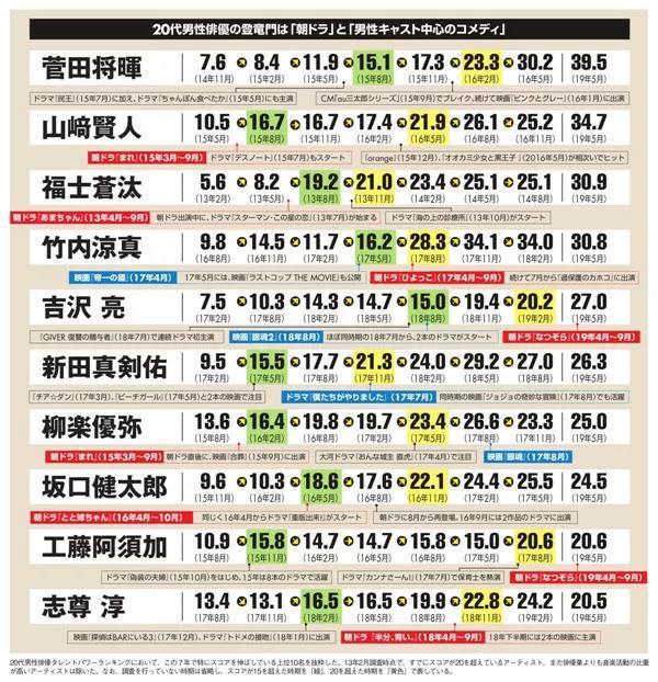表格(下图)当中显示了获得20代男演员明星影响力排行榜前几名男演员7年的分数推移。说到男演员的登龙门,很多人都会想到《假面骑士》系列和《战队》系列吧。菅田将晖出演了《假面骑士W》(2009年)、福士苍汰出演了《假面骑士Fourze》(2011年)、志尊淳(24岁)出演了《归来的烈车战队特急者》(2014年),确实至今仍然具有很大的影响力。不过《假面骑士》和《战队》更多是让新人男演员抓住出道的契机,作为演员积累初期经验。这个表格中首先最引人注目的就是“晨间剧”。“晨间剧”一直作为新人女演员的登龙门为人熟知,最近对于男演员来说,也成了能够大幅度提高知名度的机会。