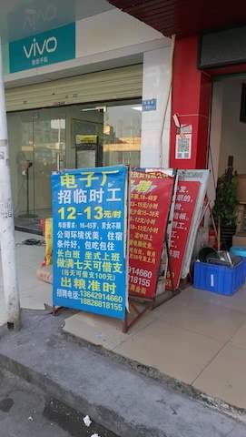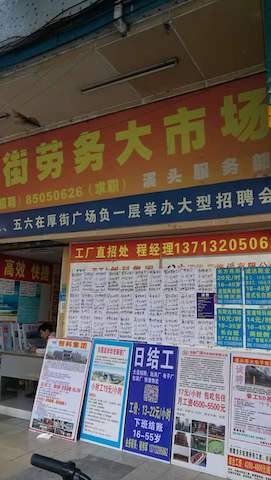 而在距离不远的厚街劳务大市场,临时工招聘的单子更是密密麻麻贴了一整面墙,老板甚至没有时间和精力来美化润色一下招聘单,直接A4纸手写贴在墙上。