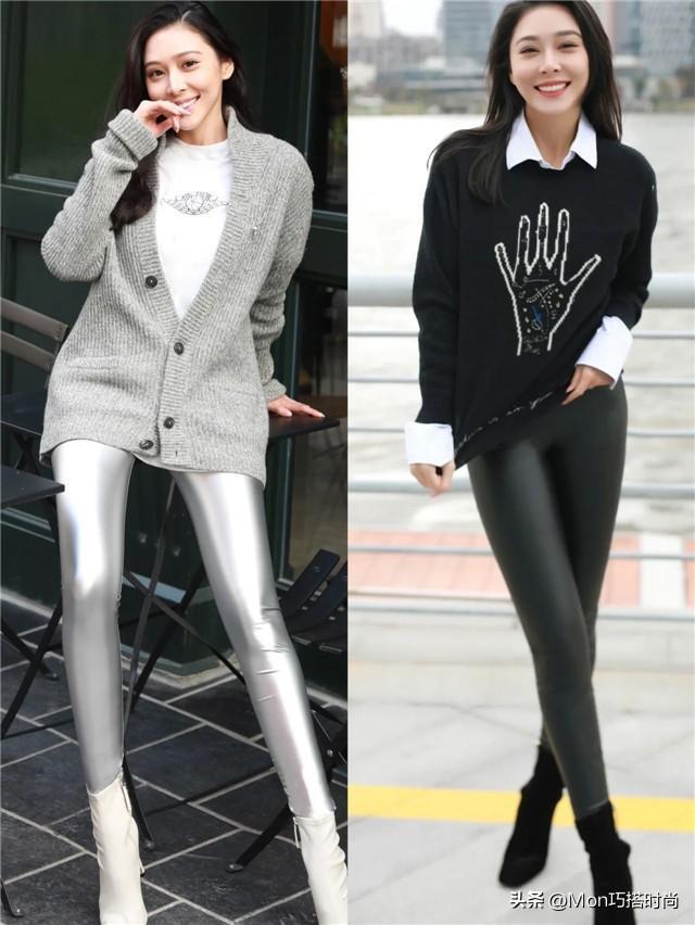 反光的材质最大的缺点就是会显胖,大多数的反光面料会从视觉上拉宽我们的身材围度,比如大家熟悉的皮革材质、镭射材质,都容易造成反光感,显得浮夸还显壮。尤其是下面这类银色的反光打底裤,色彩和材质都是不好驾驭的。