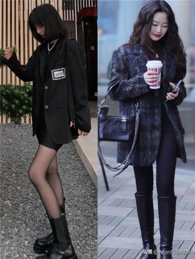 靴子款式也比较多,比如小个子穿短靴,高个子穿长筒靴,都还蛮时髦的。穿的时候也最好遵循顺色搭配法则,靴子和打底裤颜色一致,更好地拉伸你的双腿。