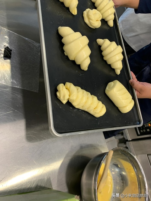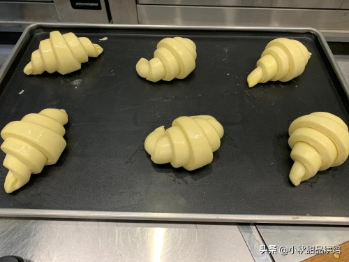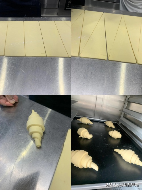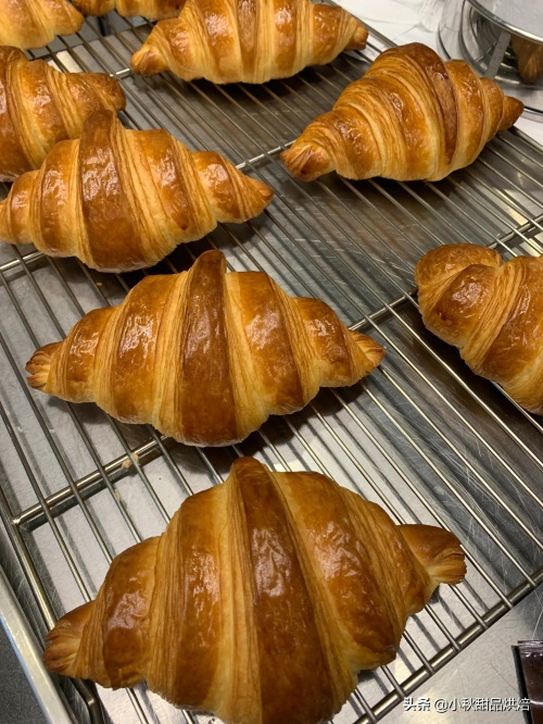 可颂一般指的是牛角包,口感比较酥脆,因为是开酥面包,开酥的面包口感都特别酥,因为含油量大,也比较香,市面上可颂的品种也特别多,下面我就详细的教大家制作原味的可颂吧: