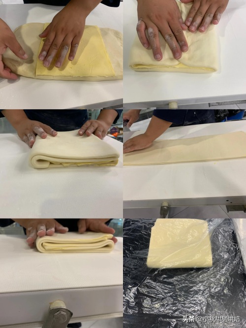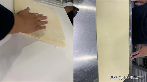 面解冻到橡皮泥的质感开酥一定要快来回都降一格多洒粉防粘四折一一次,三折一一次面团太软了冷冻下再继续开酥,72长宽28,斜着开