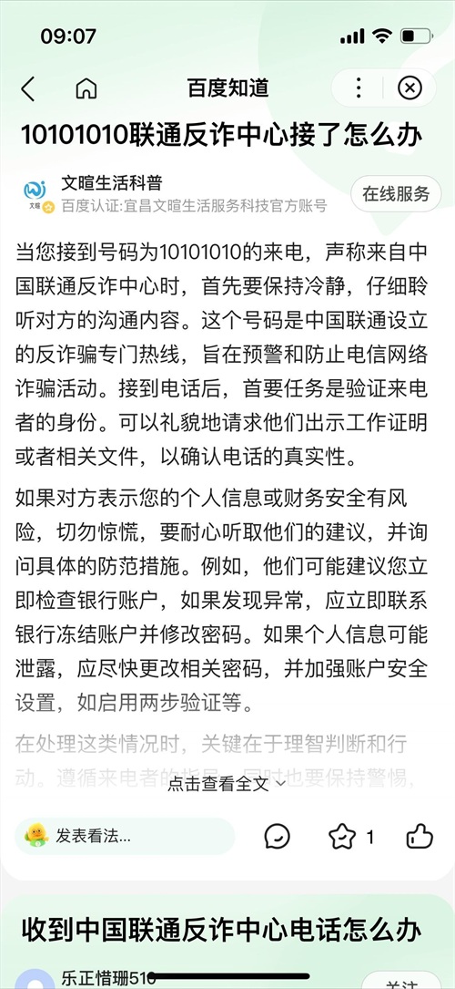结果确实看到有不少朋友接到了同样的电话,内容也大致相同,但是关于10101010某度给出的反馈确实是中国联通的反诈电话。并不是我以为的反诈电话。