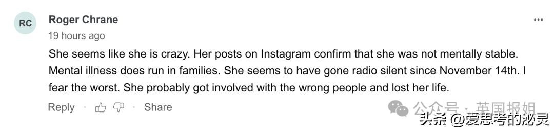 “她看起来有些怪,社媒上看着精神不稳定,精神疾病确实有家族遗传。11月14号后她就彻底消失了,我担心最坏的情况。怕不是和错误的人扯上了关系,最终失去生命。”