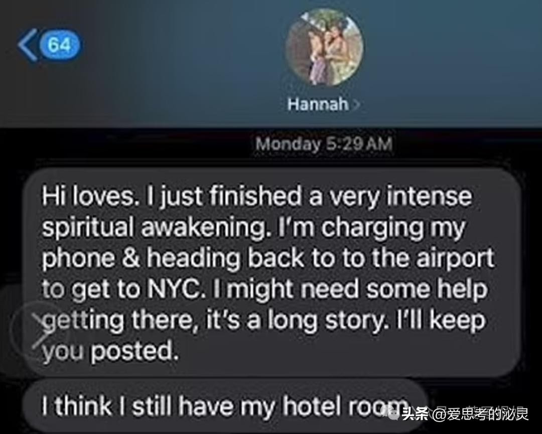 (亲爱的,我刚刚完成了一次强烈的精神觉醒。我正在给手机充电,然后回机场去纽约,可能需要一些帮助才能到达。说来话长,我会保持联系!)汉娜的朋友提到,汉娜发短信说到她很害怕,不能回家之类的: