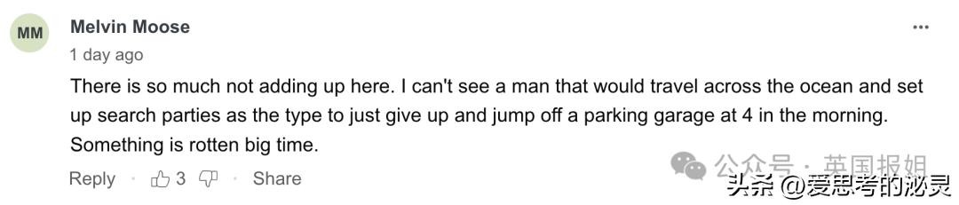 “事件细节不够,一个漂洋过海组建搜索队的人,会在凌晨4点放弃寻找孩子从停车场跳下去??肯定有猫腻。”