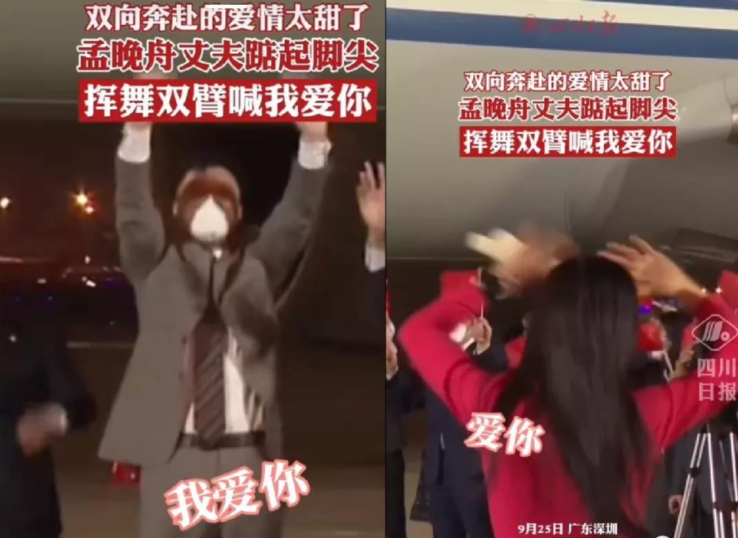 孟晚舟在听到丈夫的告白之后,也幸福地挥手回应道“我爱你!”