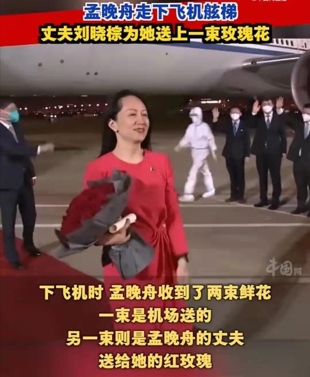走下飞机的那一刻,孟晚舟收到了两束鲜花,一束代表的是国家和人民对她的欢迎;另一束鲜红的玫瑰花,代表的则是丈夫刘晓棕对她热切的爱。