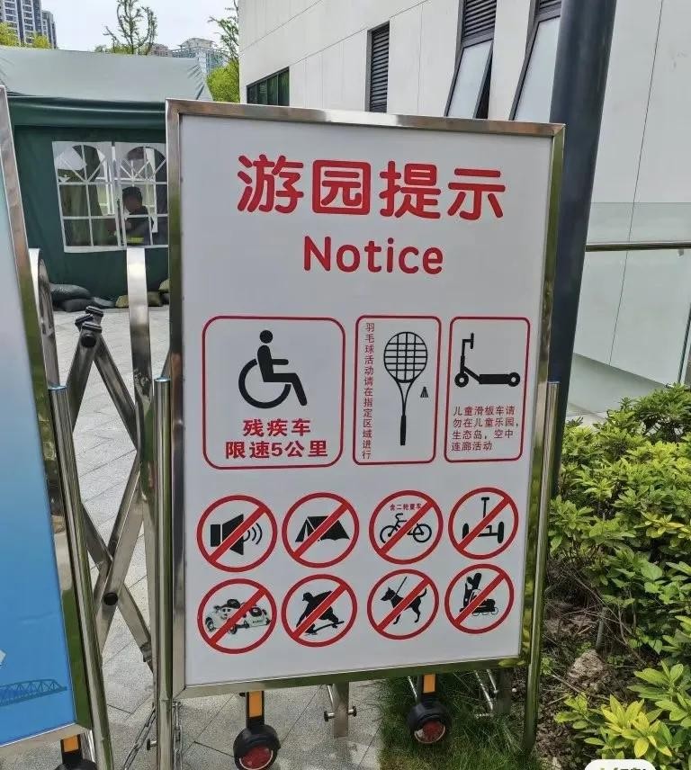 禁止搭帐篷、禁止放易燃物、禁止烟火、禁止攀登、禁止游泳、禁止垂钓、禁止自行车、禁止滑板车、禁止无人机、禁止携带宠物......等等。