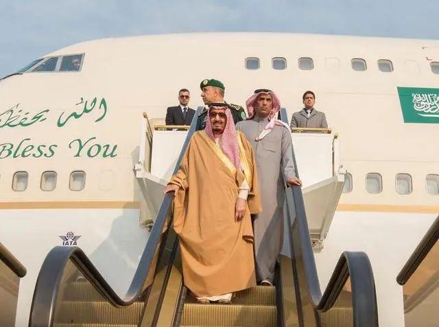 国王萨勒曼的专机,是定制专机,内部全部由纯金装饰,就连自带的舷梯也是镀金而成,当他乘坐舷梯缓缓而下时,给人感觉就像从一朵黄金云上飘了下来……