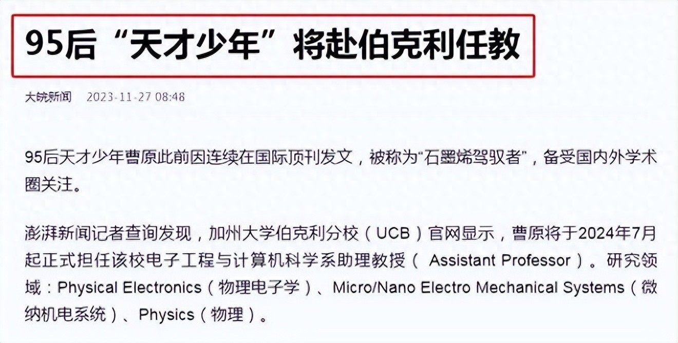 曹原,一位年仅25岁的95后,“天才少年”,即将前往加州大学伯克利分校担任教职。曹原之所以备受瞩目,是因为他在石墨烯领域的研究成果引起了广泛关注。被誉为“石墨烯驾驭者”,他凭借着卓越的科研实力以及创新的思维方式,重新定义了石墨烯在未来科技领域的应用。