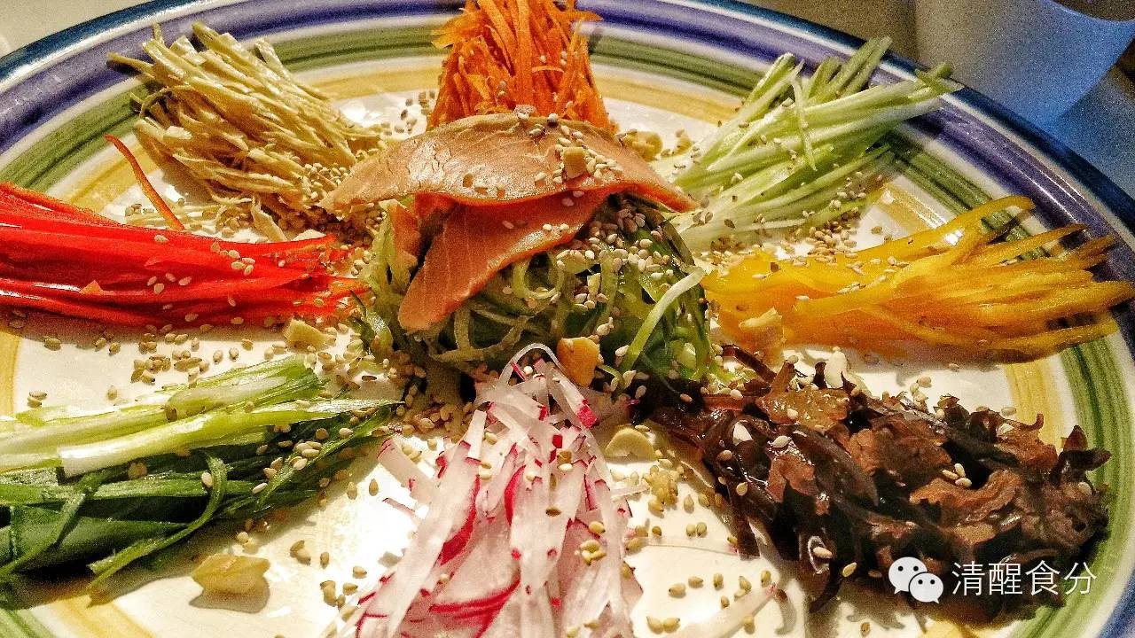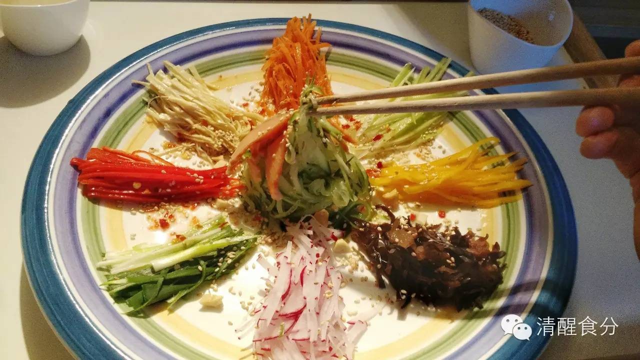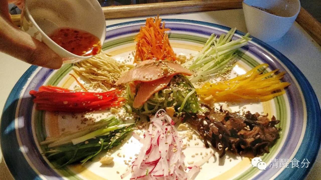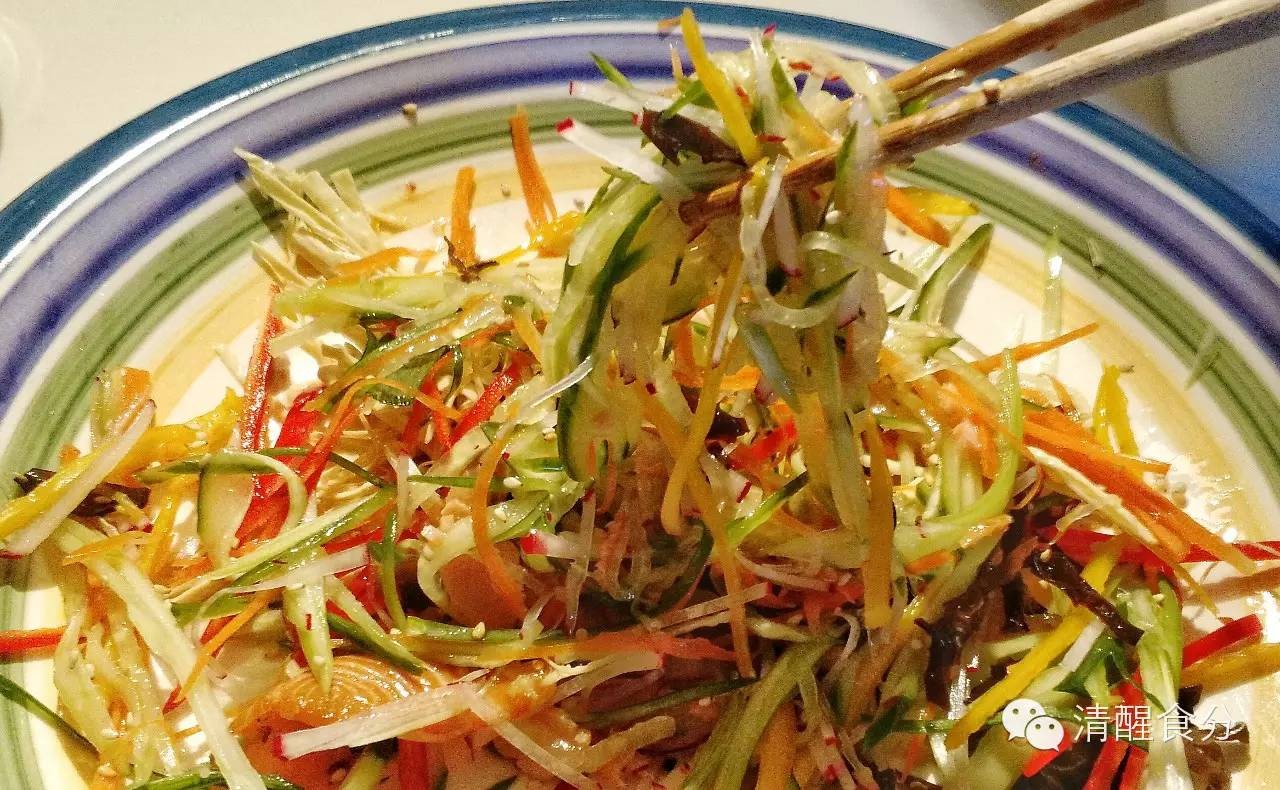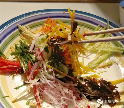 把所有蔬菜切丝,整齐地排在大碟子上