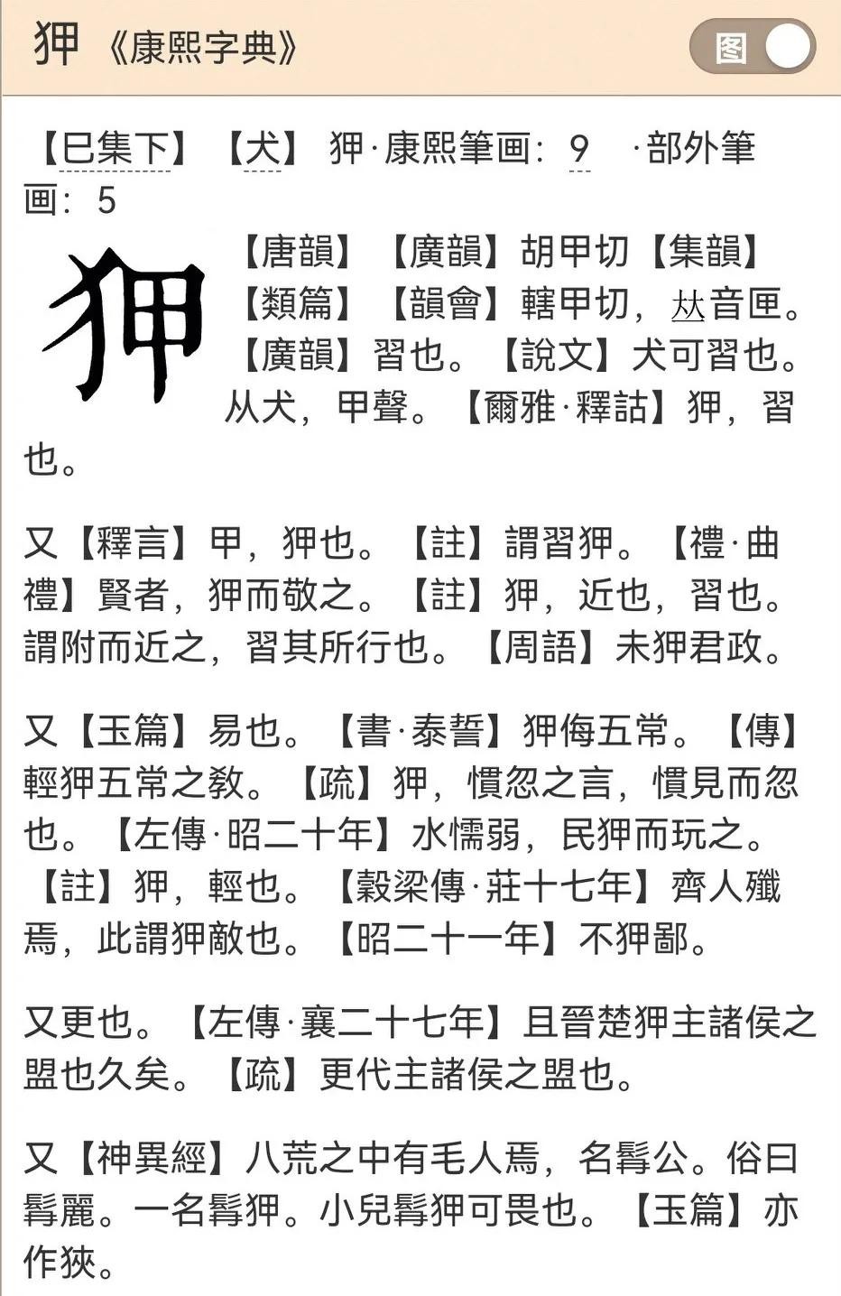 狎,汉语二级字,读作狎(xiá),形声。从犬,甲声。从犬,犬善与人玩耍。本义指驯犬。
