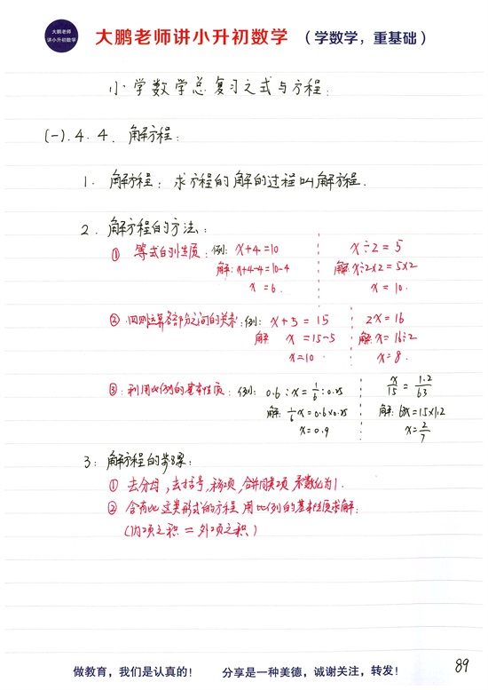 (1) 解方程:求方程的解的过程叫解方程。