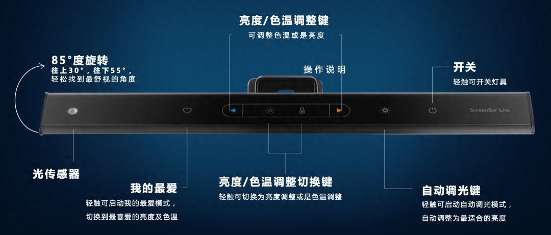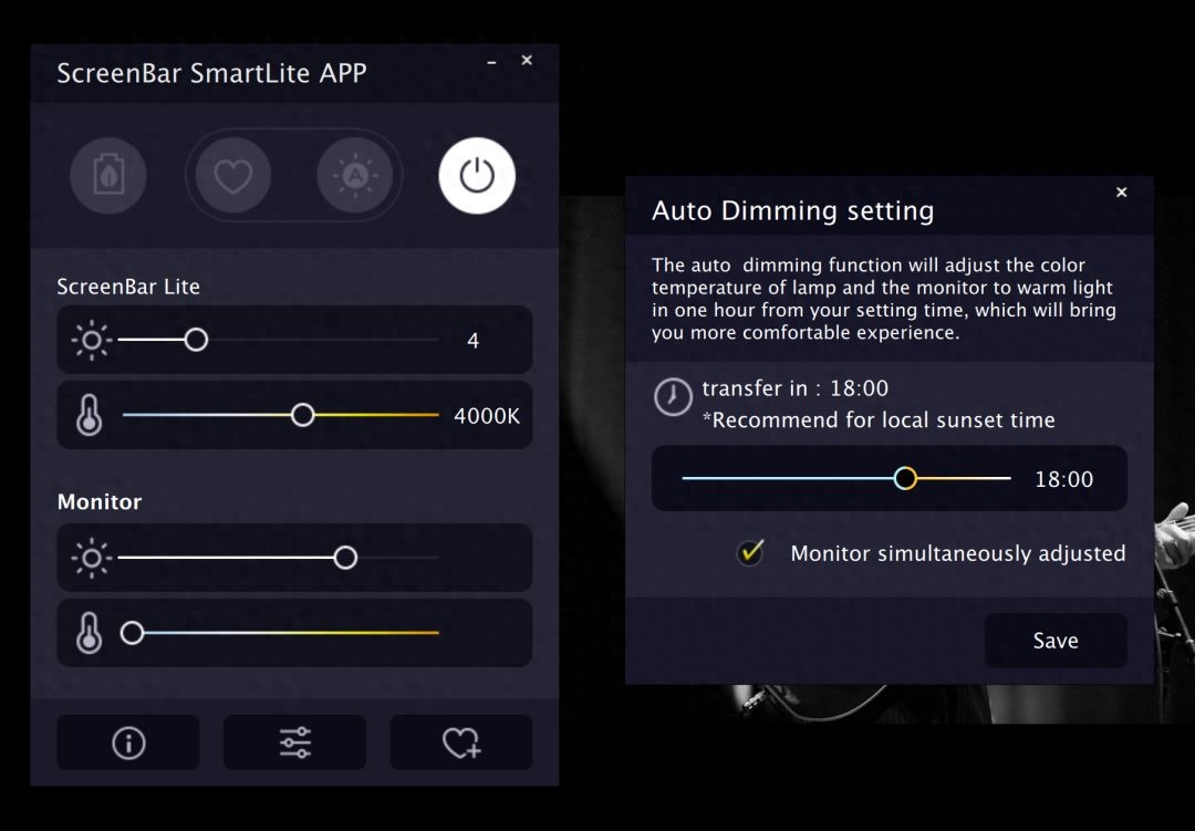 除了设备本身的控制外,ScreenBar Lite 还设计了 App 的控制功能,通过明基给我们电脑配置的 App(可在benqscreenbar.com下载),我们可以对产品进行自动的色温调节以及远程细节调整等等,实现了智能办公设备应有的功能,让你不动手也可以完成对光的情况的掌控。